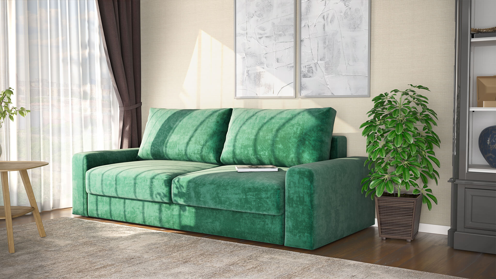Диван с легкостью раскладывается с помощью механизма трансформации «Еврокнижка», формируя из сиденья и спинки равномерное спальное место.